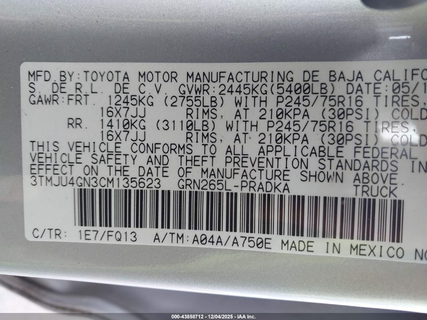 2012 TOYOTA TACOMA 2012 року Бензин, 4.0, , vin - 3TMJU4GN3CM135623 из США