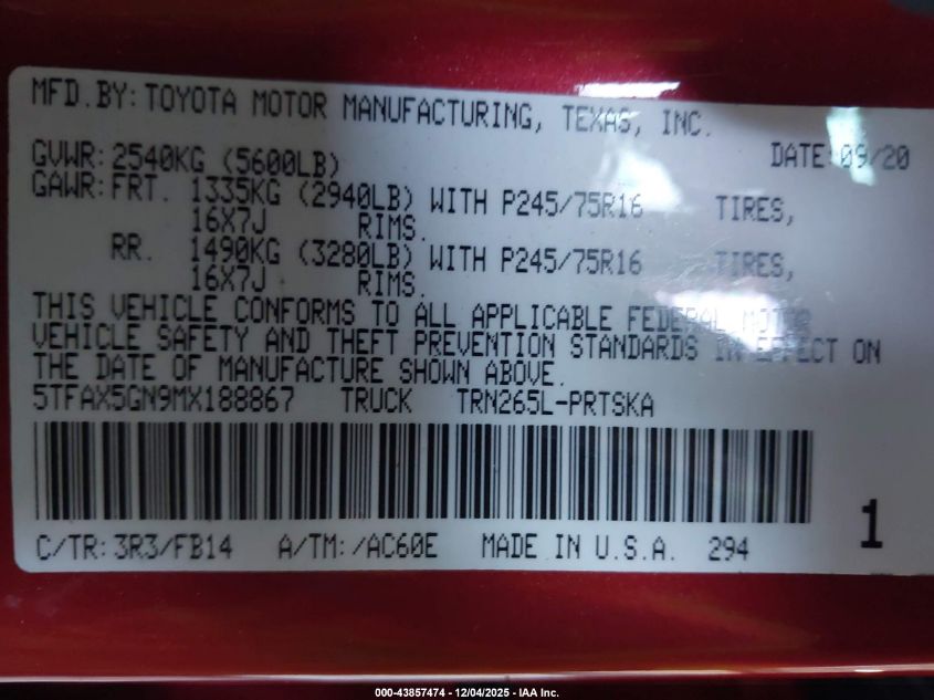 2021 TOYOTA TACOMA 2021 року Бензин, 2.7, , vin - 5TFAX5GN9MX188867 из США