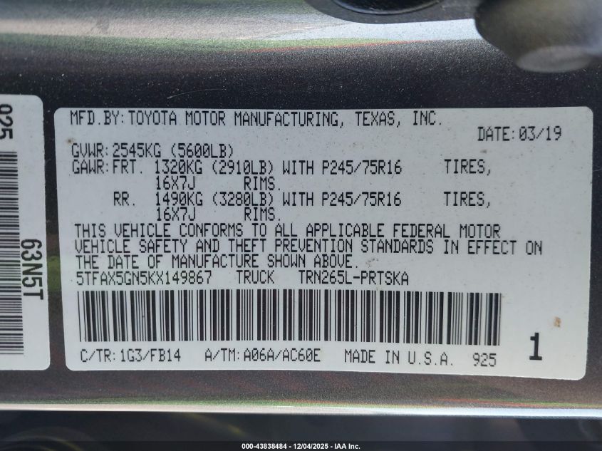 2019 TOYOTA TACOMA 2019 року Бензин, 2.7, , vin - 5TFAX5GN5KX149867 из США