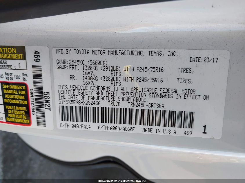 2017 TOYOTA TACOMA 2017 року Бензин, 2.7, Полный привод, vin - 5TFSX5EN8HX052436 из США