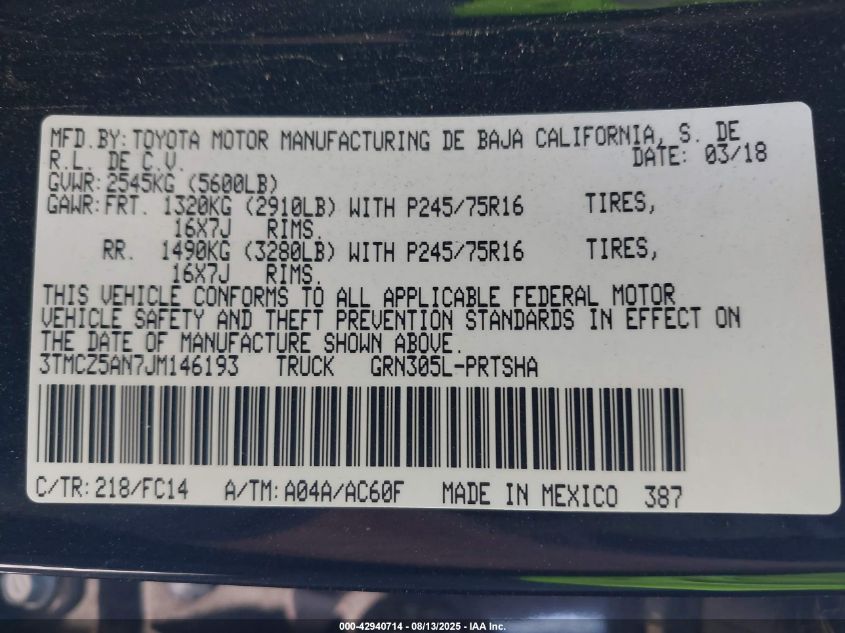 2018 TOYOTA TACOMA 2018 року Бензин, 3.5, Полный привод, vin - 3TMCZ5AN7JM146193 из США