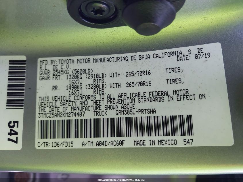 2019 TOYOTA TACOMA 2019 року Бензин, 3.5, Полный привод, vin - 3TMCZ5AN2KM274407 из США