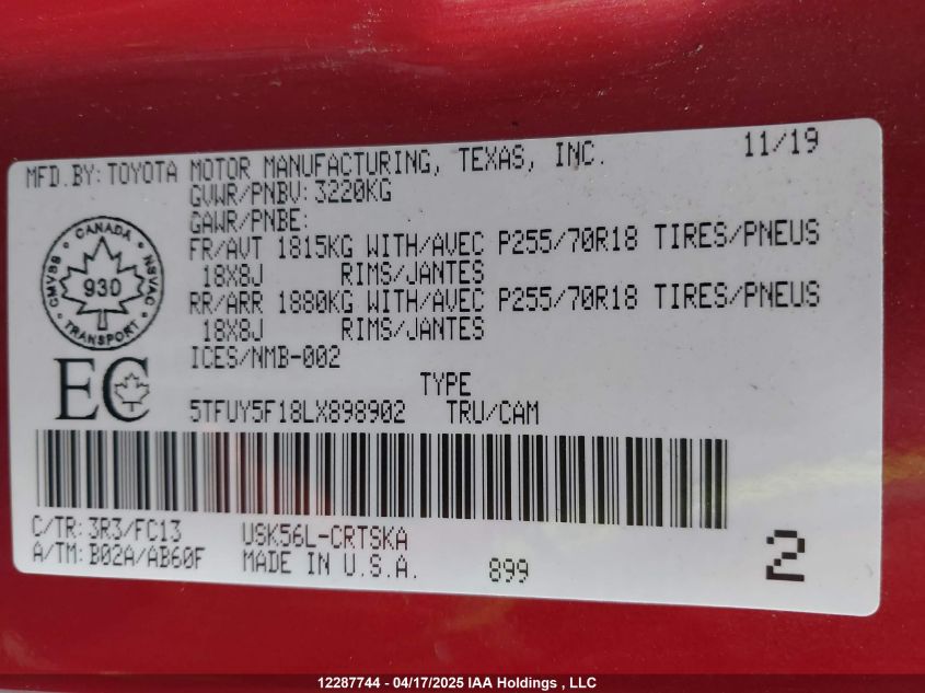 2020 TOYOTA TUNDRA 2020 року Бензин, , Полный привод, vin - 5TFUY5F18LX898902 из США