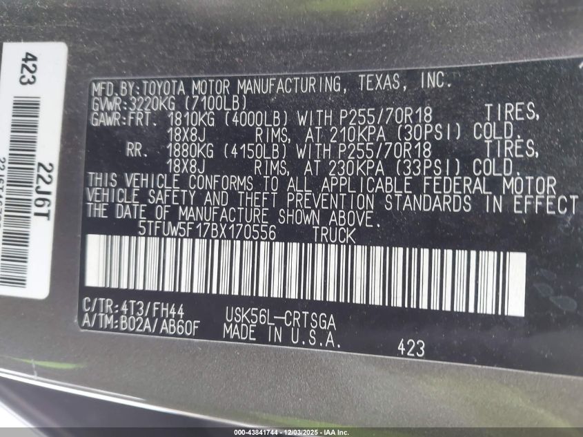 2011 TOYOTA TUNDRA 2011 року Бензин, 5.7, Полный привод, vin - 5TFUW5F17BX170556 из США