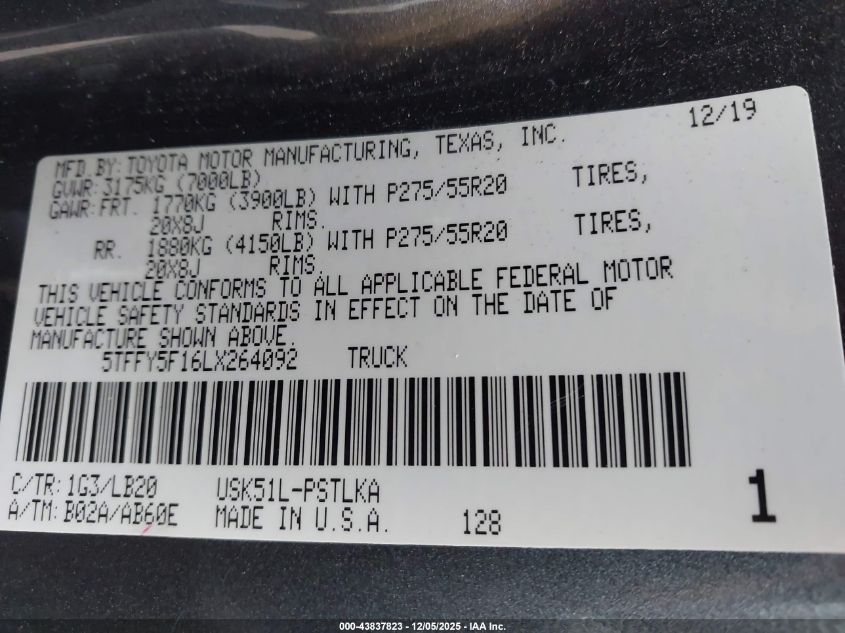2020 TOYOTA TUNDRA 2020 року Бензин, 5.7, , vin - 5TFFY5F16LX264092 из США