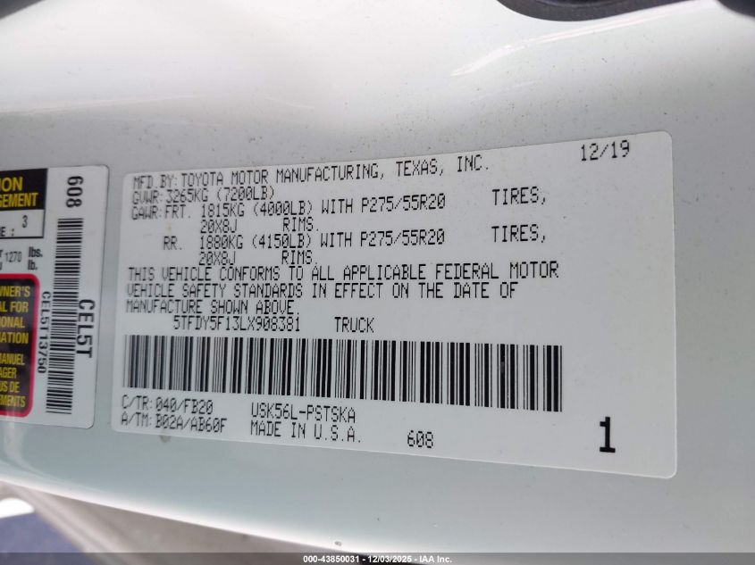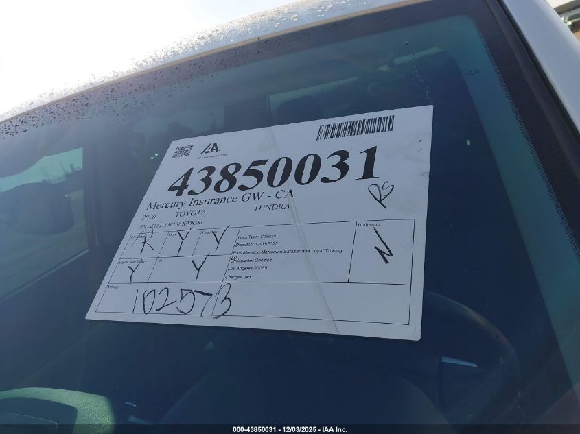 2020 TOYOTA TUNDRA 2020 року Бензин, 5.7, Полный привод, vin - 5TFDY5F13LX908381 из США