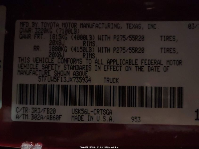 2018 TOYOTA TUNDRA 2018 року Бензин, 5.7, Полный привод, vin - 5TFUW5F13JX735934 из США