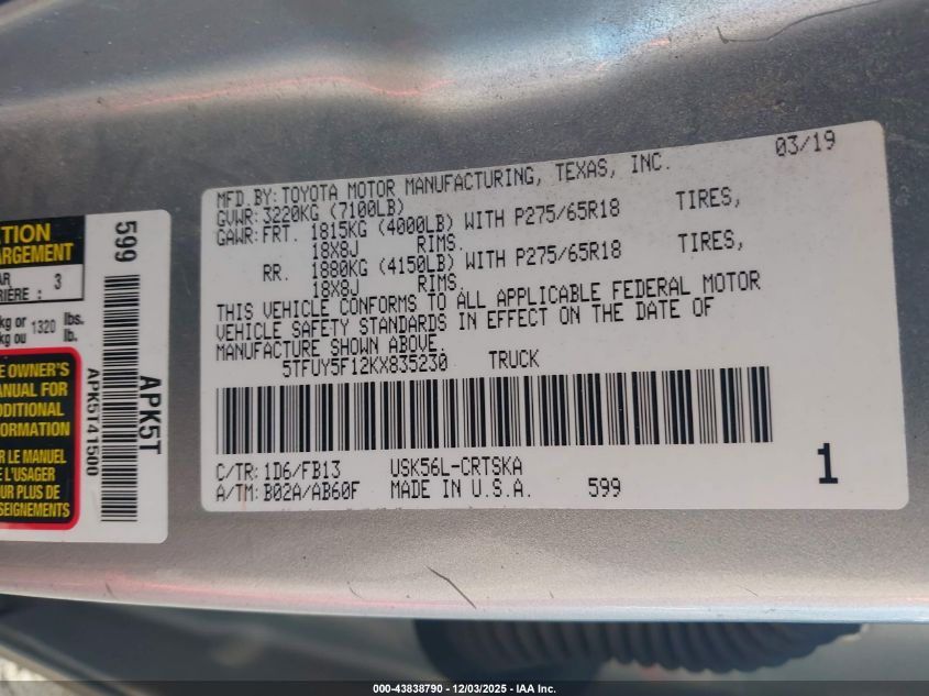 2019 TOYOTA TUNDRA 2019 року Бензин, 5.7, Полный привод, vin - 5TFUY5F12KX835230 из США