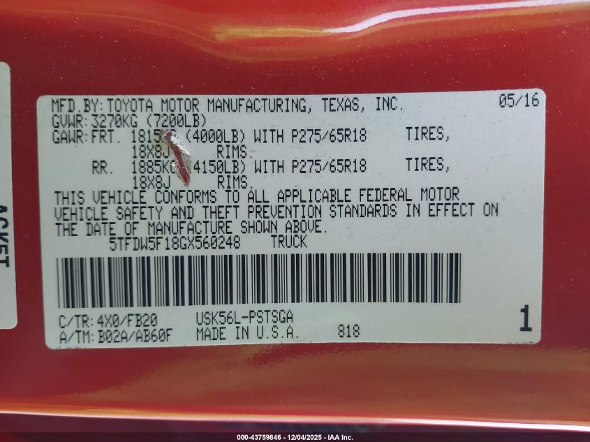 2016 TOYOTA TUNDRA 2016 року Бензин, 5.7, Полный привод, vin - 5TFDW5F18GX560248 из США