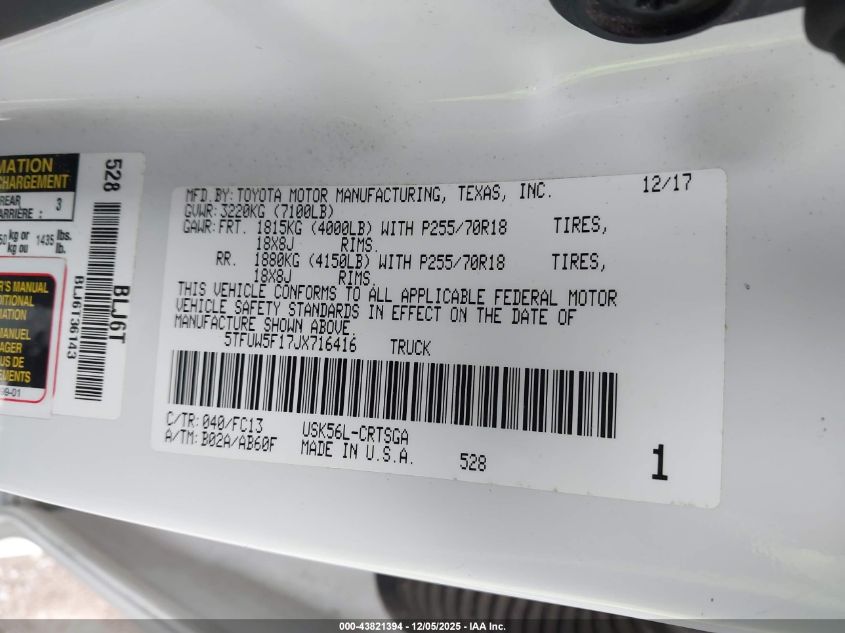 2018 TOYOTA TUNDRA 2018 року Бензин, 5.7, Полный привод, vin - 5TFUW5F17JX716416 из США