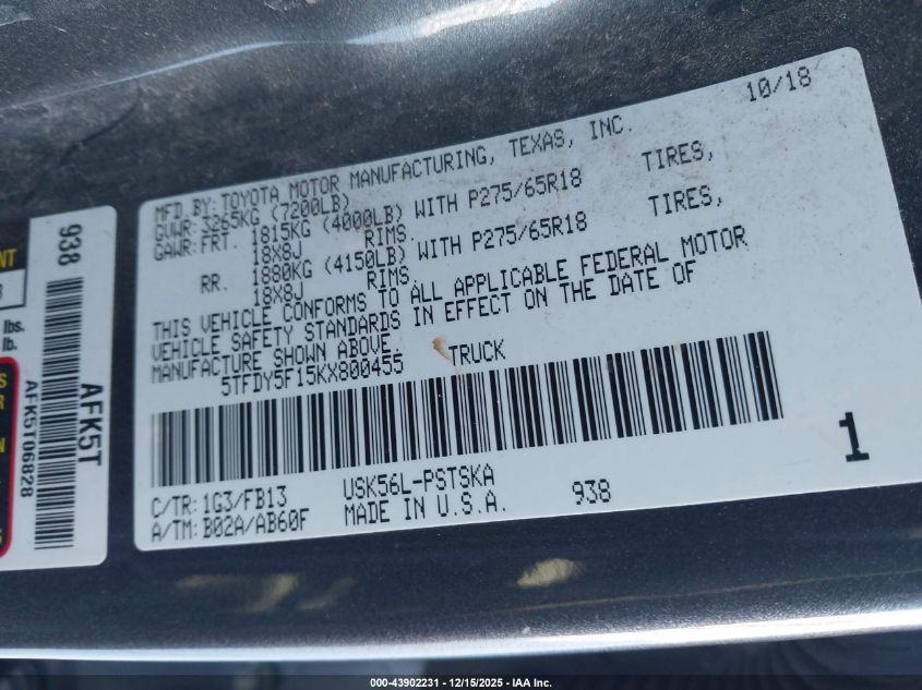 2019 TOYOTA TUNDRA 2019 року Бензин, 5.7, Полный привод, vin - 5TFDY5F15KX800455 из США