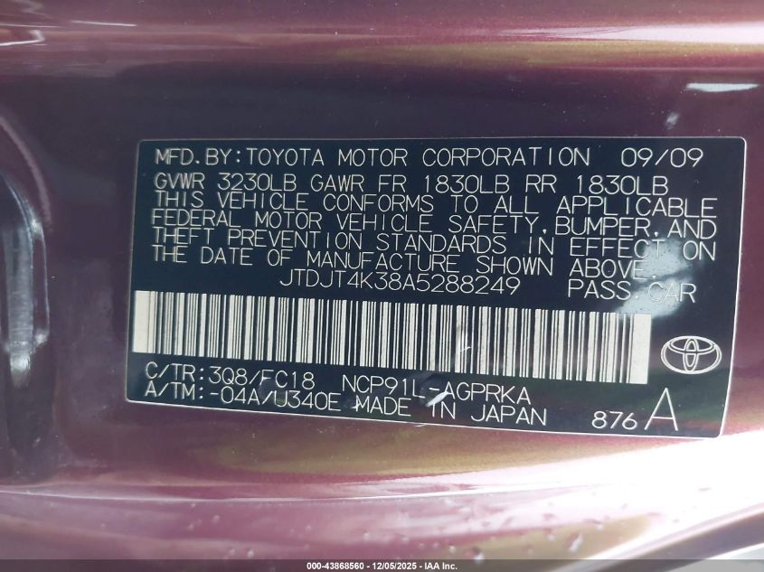 Цвет ФиолетовыйЦилиндры 4Привод Передний приводVIN JTDJT4K38A5288249Состояние Заводится и едет (проверено)Повреждения Передняя или задняя AutoRIA