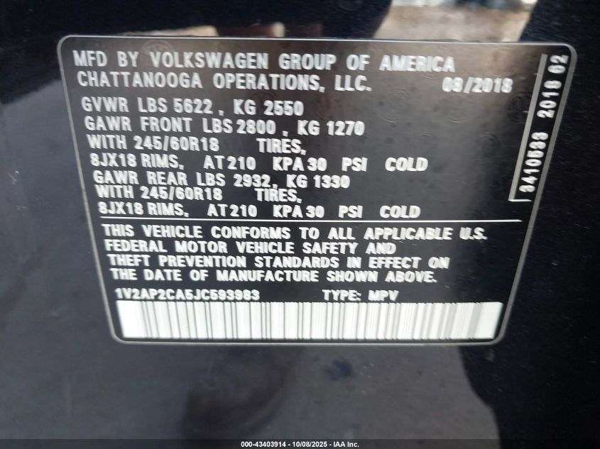 2018 VOLKSWAGEN ATLAS 2018 року Бензин, 2.0, Передний привод, vin - 1V2AP2CA5JC593983 из США