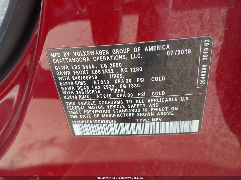 2019 VOLKSWAGEN ATLAS 2019 року Бензин, 2.0, Передний привод, vin - 1V2DP2CA1KC588245 из США