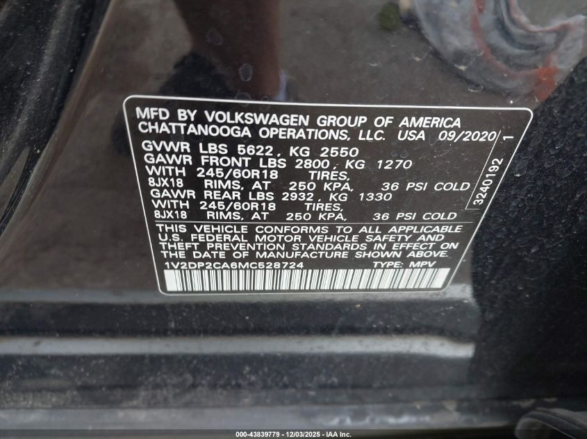 2021 VOLKSWAGEN ATLAS 2021 року Бензин, 2.0, Передний привод, vin - 1V2DP2CA6MC528724 из США