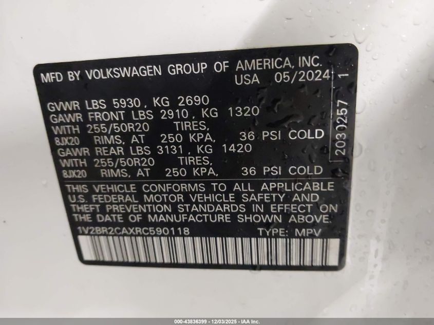 2024 VOLKSWAGEN ATLAS 2024 року Бензин, 2.0, Полный привод, vin - 1V2BR2CAXRC590118 из США
