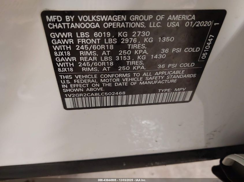 2020 VOLKSWAGEN ATLAS 2020 року Бензин, 3.6, Полный привод, vin - 1V2GR2CA8LC502468 из США
