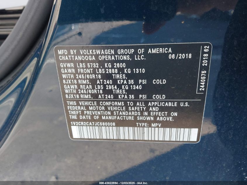 2018 VOLKSWAGEN ATLAS 2018 року Бензин, 3.6, Передний привод, vin - 1V2CR2CA7JC580008 из США