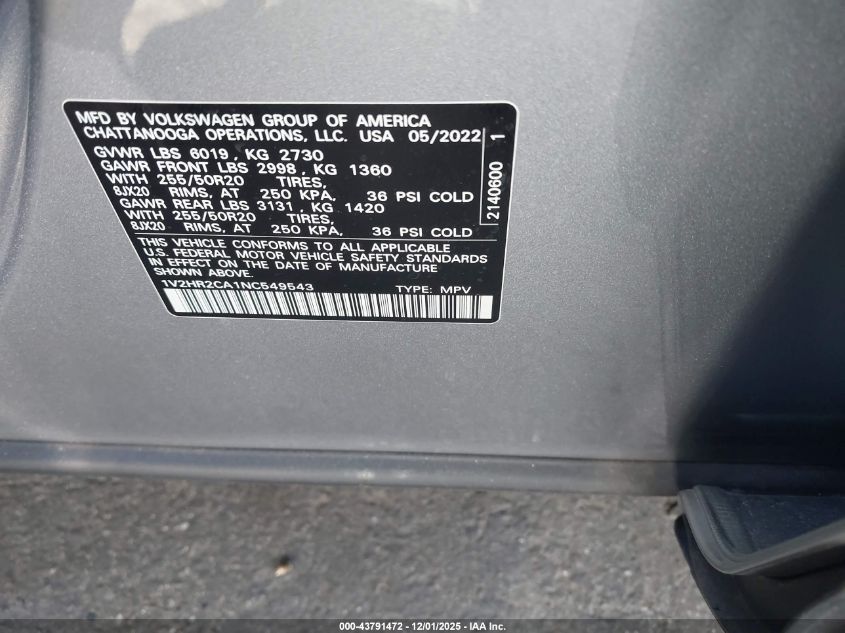 2022 VOLKSWAGEN ATLAS 2022 року Бензин, 3.6, Полный привод, vin - 1V2HR2CA1NC549543 из США