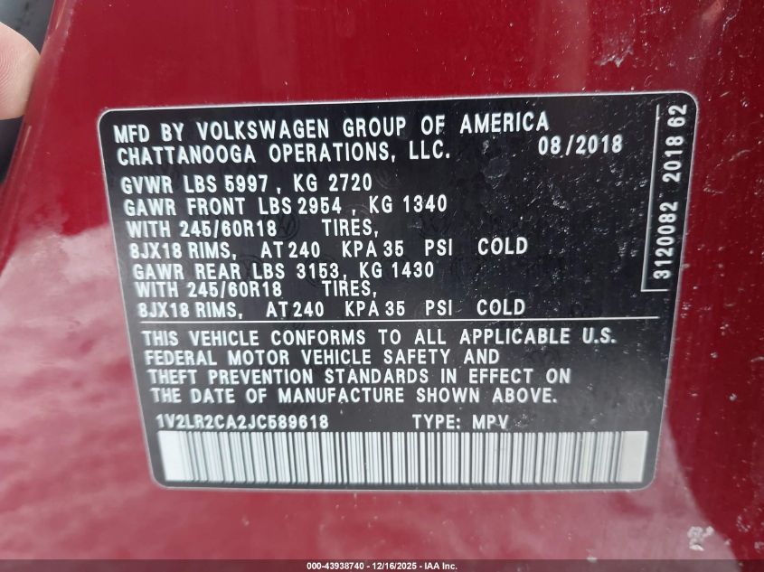 2018 VOLKSWAGEN ATLAS 2018 року Бензин, 3.6, Полный привод, vin - 1V2LR2CA2JC589618 из США