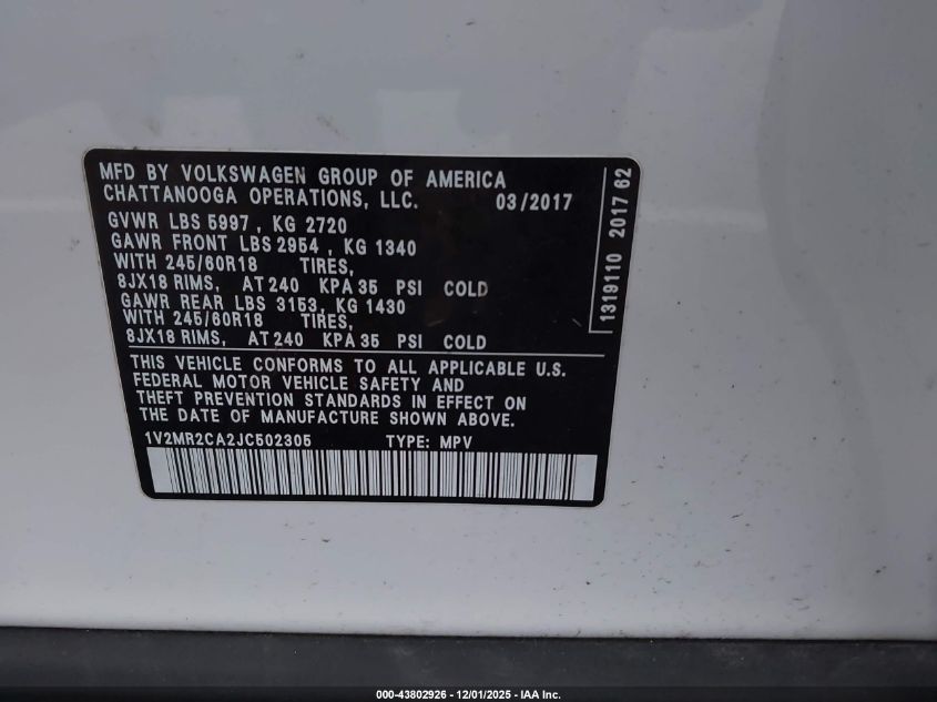 2018 VOLKSWAGEN ATLAS 2018 року Бензин, 3.6, Полный привод, vin - 1V2MR2CA2JC502305 из США