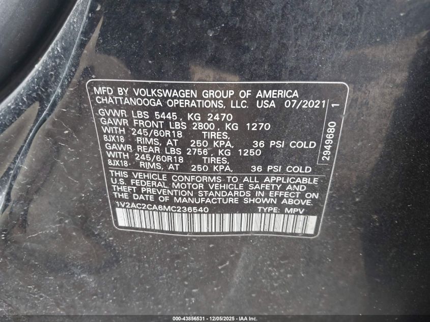 2021 VOLKSWAGEN ATLAS CROSS SPORT 2021 року Бензин, 2.0, Передний привод, vin - 1V2AC2CA6MC236540 из США