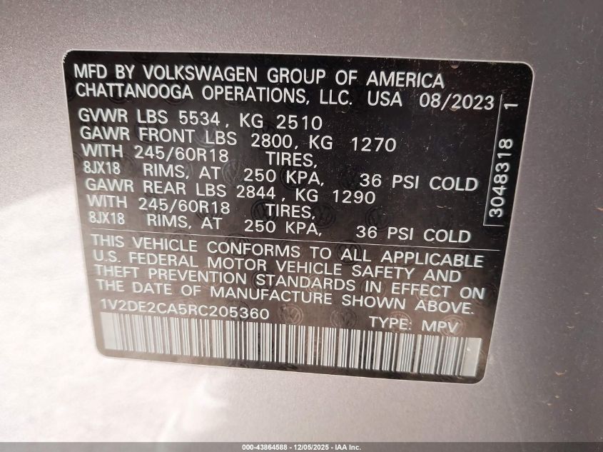 2024 VOLKSWAGEN ATLAS CROSS SPORT 2024 року Бензин, 2.0, Передний привод, vin - 1V2DE2CA5RC205360 из США
