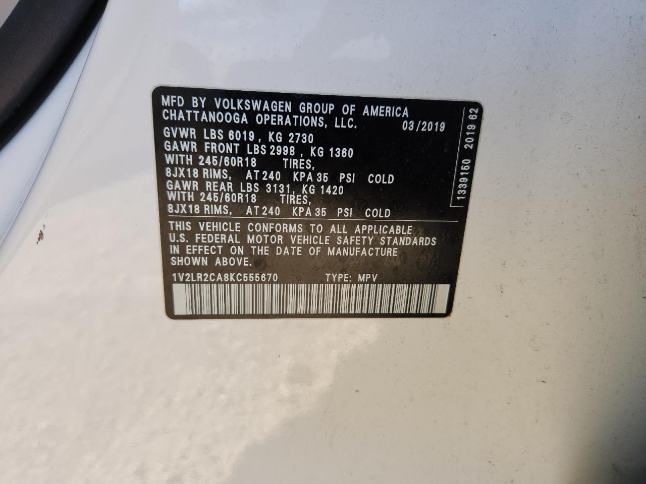 2019 VOLKSWAGEN ATLAS 2019 року Бензин, 3.6, Полный привод, vin - 1V2LR2CA8KC555670 из США