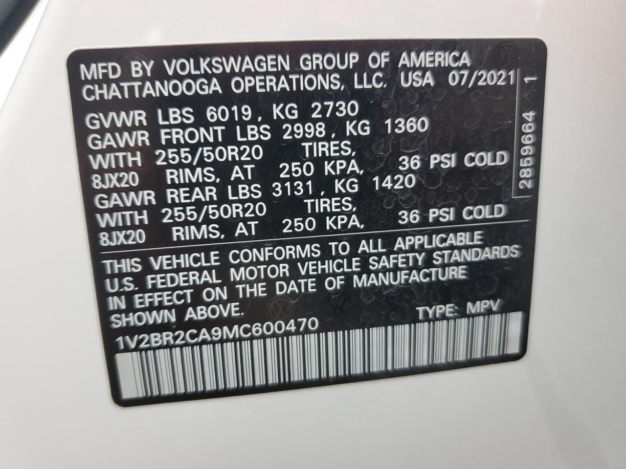 2021 VOLKSWAGEN ATLAS 2021 року Бензин, 3.6, Полный привод, vin - 1V2BR2CA9MC600470 из США