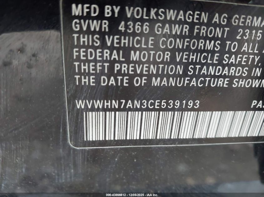 2012 VOLKSWAGEN CC 2012 року Бензин, 2.0, Передний привод, vin - WVWHN7AN3CE539193 из США