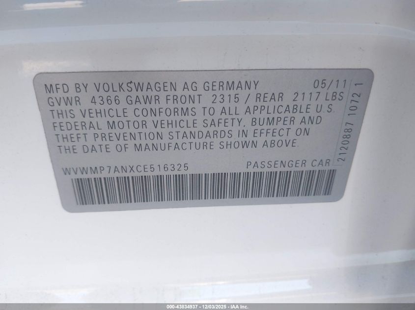 Цвет БелыйЦилиндры 4Привод Передний приводVIN WVWMP7ANXCE5X6325Состояние Заводится и едет (проверено)Повреждения Передняя праваяДата аукциона 2025-12-10 AutoRIA