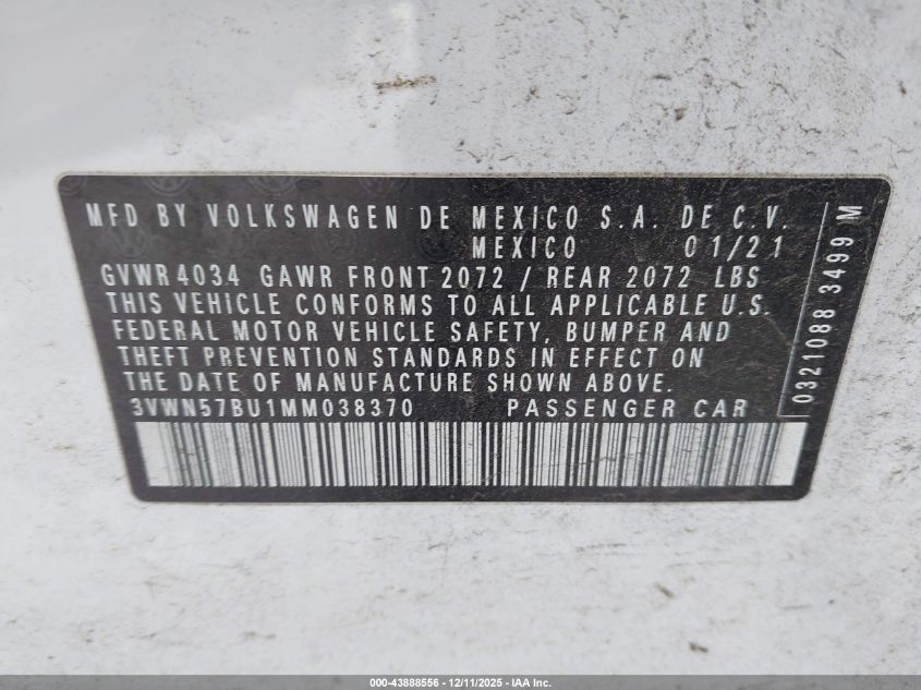 2021 VOLKSWAGEN JETTA 2021 року Бензин, 1.4, Передний привод, vin - 3VWN57BU1MM038370 из США