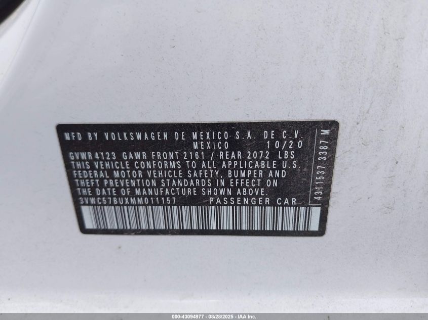 2021 VOLKSWAGEN JETTA 2021 року Бензин, 1.4, Передний привод, vin - 3VWC57BUXMM011157 из США