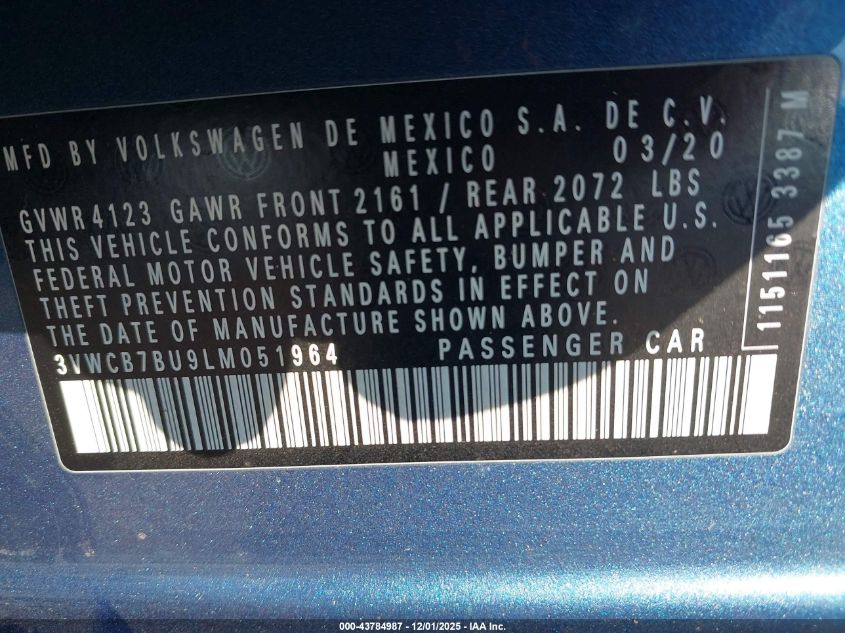 2020 VOLKSWAGEN JETTA 2020 року Бензин, 1.4, Передний привод, vin - 3VWCB7BU9LM051964 из США