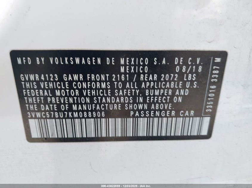 2019 VOLKSWAGEN JETTA 2019 року Бензин, 1.4, Передний привод, vin - 3VWC57BU7KM088906 из США