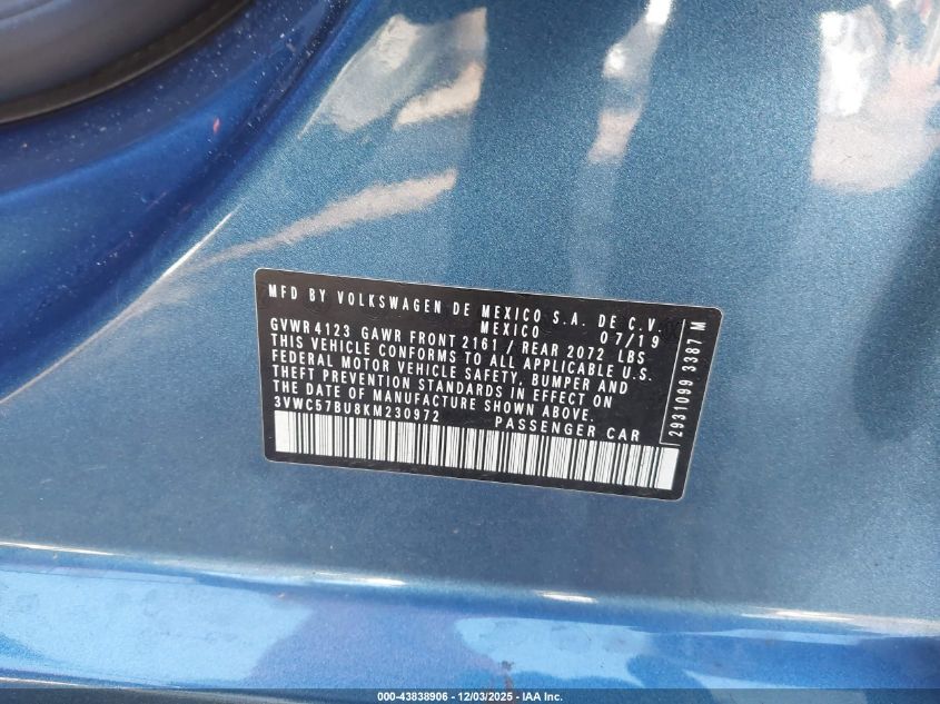 2019 VOLKSWAGEN JETTA 2019 року Бензин, 1.4, Передний привод, vin - 3VWC57BU8KM230972 из США