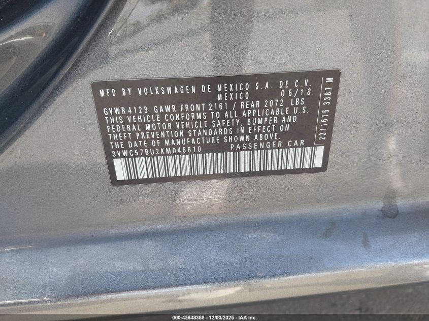 2019 VOLKSWAGEN JETTA 2019 року Бензин, 1.4, Передний привод, vin - 3VWC57BU2KM045610 из США