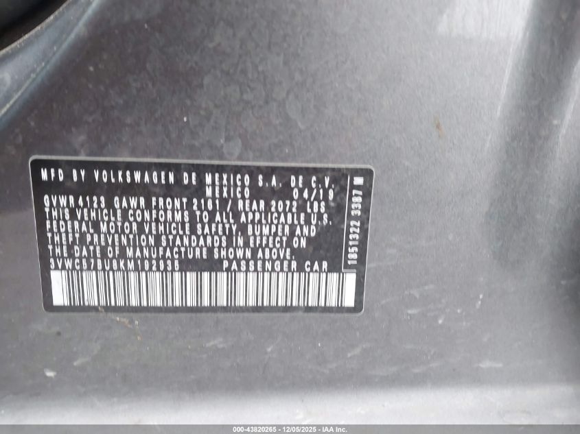 2019 VOLKSWAGEN JETTA 2019 року Бензин, 1.4, Передний привод, vin - 3VWC57BU8KM192935 из США