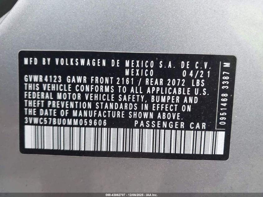 2021 VOLKSWAGEN JETTA 2021 року Бензин, 1.4, Передний привод, vin - 3VWC57BU0MM059606 из США