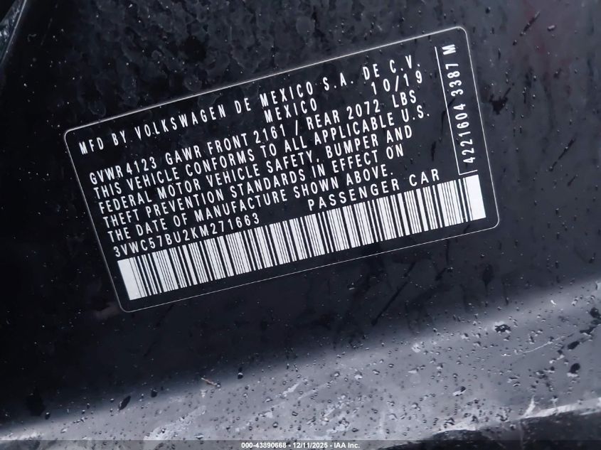 2019 VOLKSWAGEN JETTA 2019 року Бензин, 1.4, Передний привод, vin - 3VWC57BU2KM271663 из США