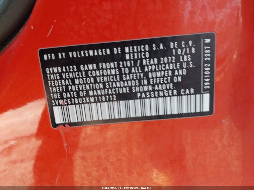 2019 VOLKSWAGEN JETTA 2019 року Бензин, 1.4, Передний привод, vin - 3VWC57BU3KM118712 из США