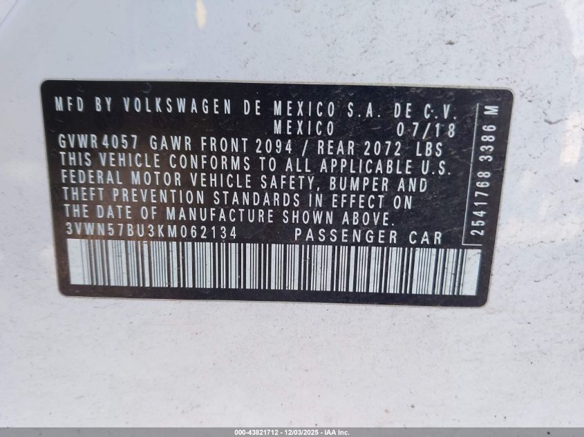 2019 VOLKSWAGEN JETTA 2019 року Бензин, 1.4, Передний привод, vin - 3VWN57BU3KM062134 из США