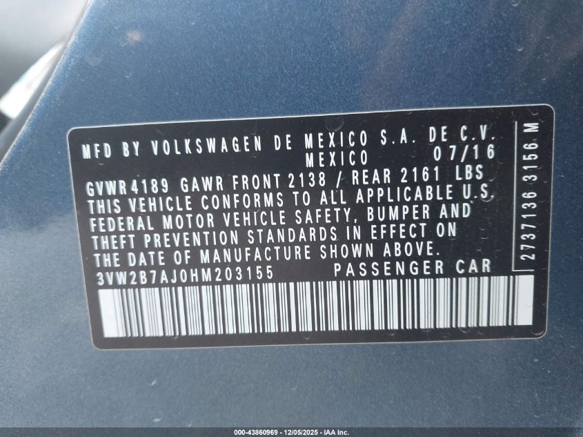 2017 VOLKSWAGEN JETTA 2017 року Бензин, 1.4, Передний привод, vin - 3VW2B7AJ0HM203155 из США