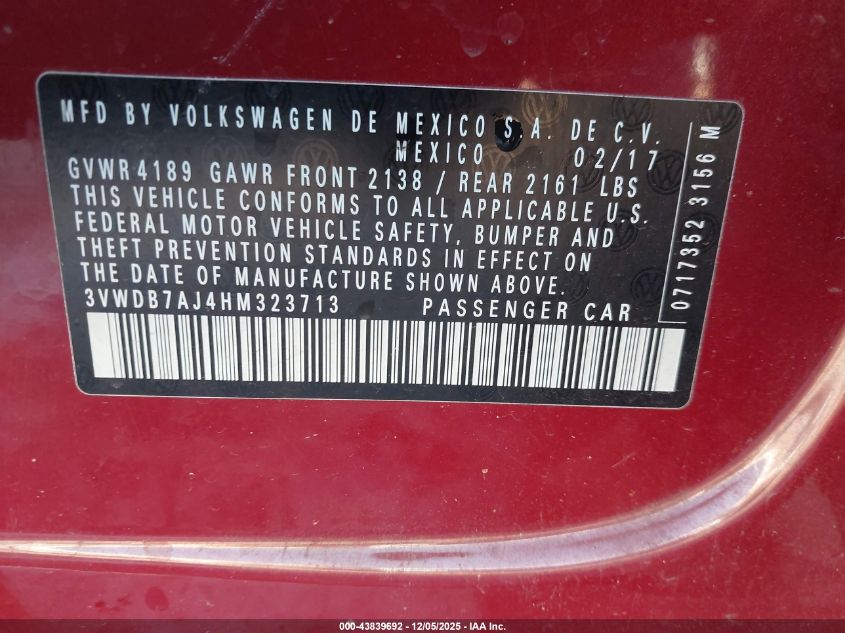 2017 VOLKSWAGEN JETTA 2017 року Бензин, 1.4, Передний привод, vin - 3VWDB7AJ4HM323713 из США