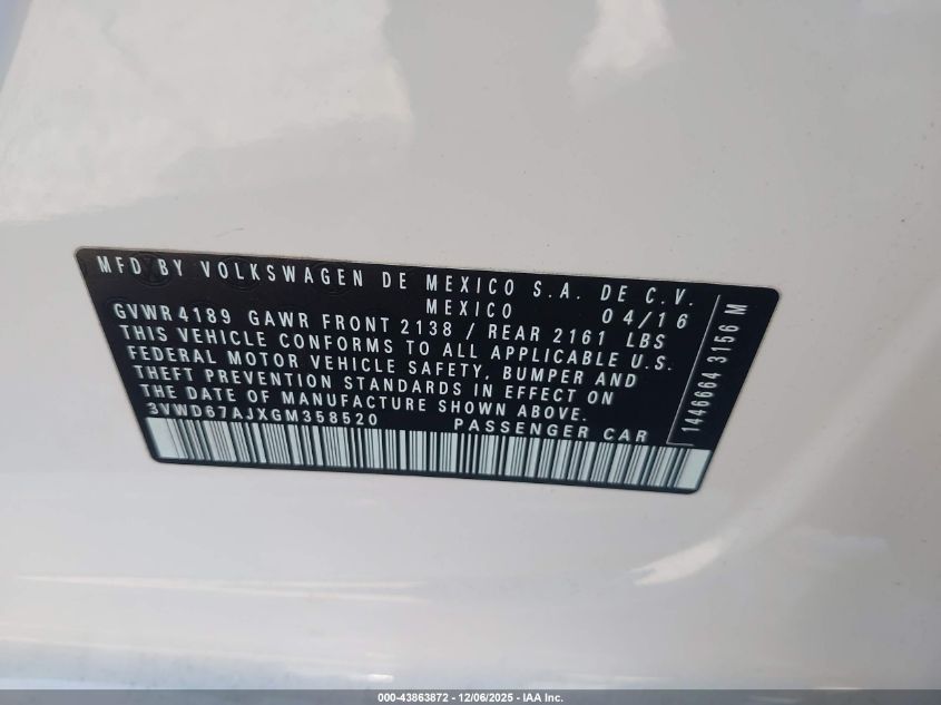 2016 VOLKSWAGEN JETTA 2016 року Бензин, 1.4, Передний привод, vin - 3VWD67AJXGM358520 из США