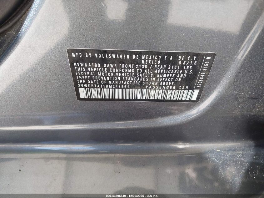 2017 VOLKSWAGEN JETTA 2017 року Бензин, 1.4, Передний привод, vin - 3VWDB7AJ1HM243561 из США
