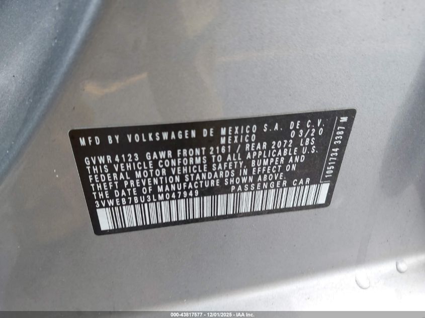 2020 VOLKSWAGEN JETTA 2020 року Бензин, 1.4, Передний привод, vin - 3VWEB7BU3LM047949 из США