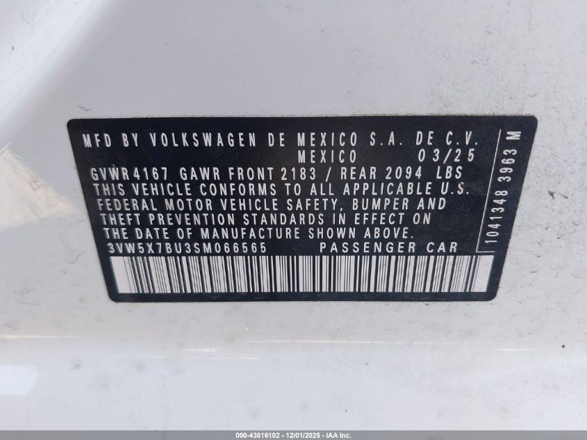 2025 VOLKSWAGEN JETTA 2025 року Бензин, 1.5, Передний привод, vin - 3VW5X7BU3SM066565 из США