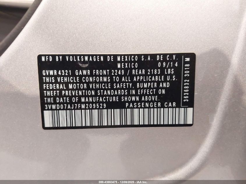 2015 VOLKSWAGEN JETTA 2015 року Бензин, 1.8, Передний привод, vin - 3VWD07AJ7FM209529 из США
