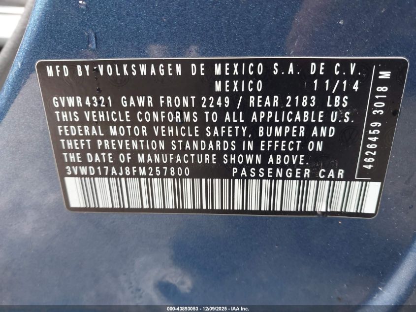 2015 VOLKSWAGEN JETTA 2015 року Бензин, 1.8, Передний привод, vin - 3VWD17AJ8FM257800 из США